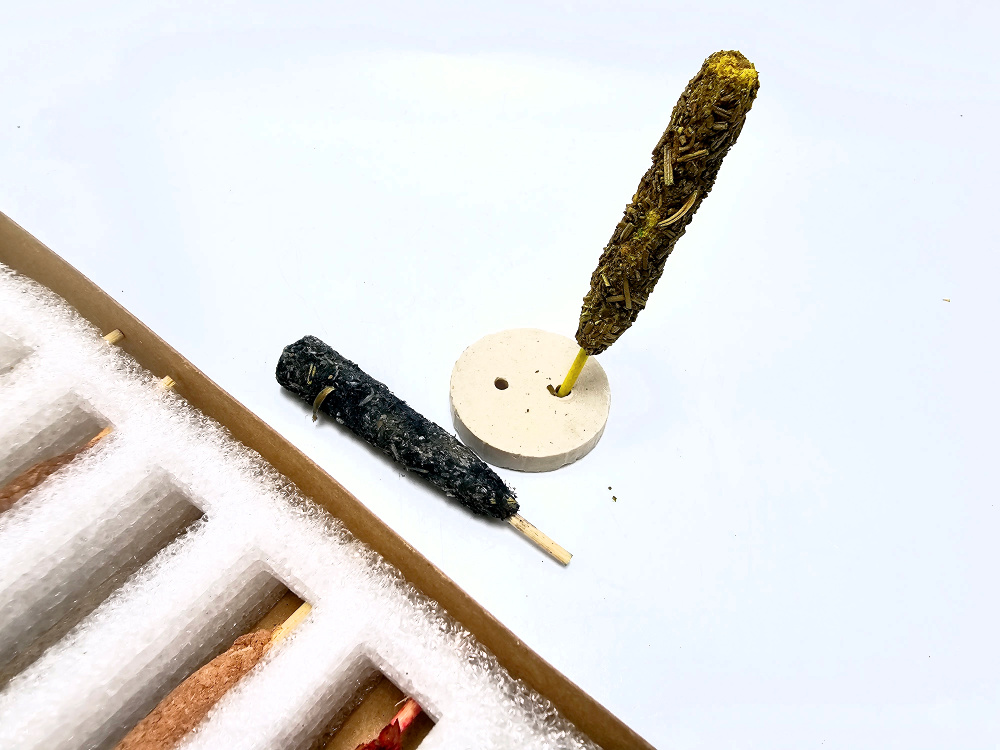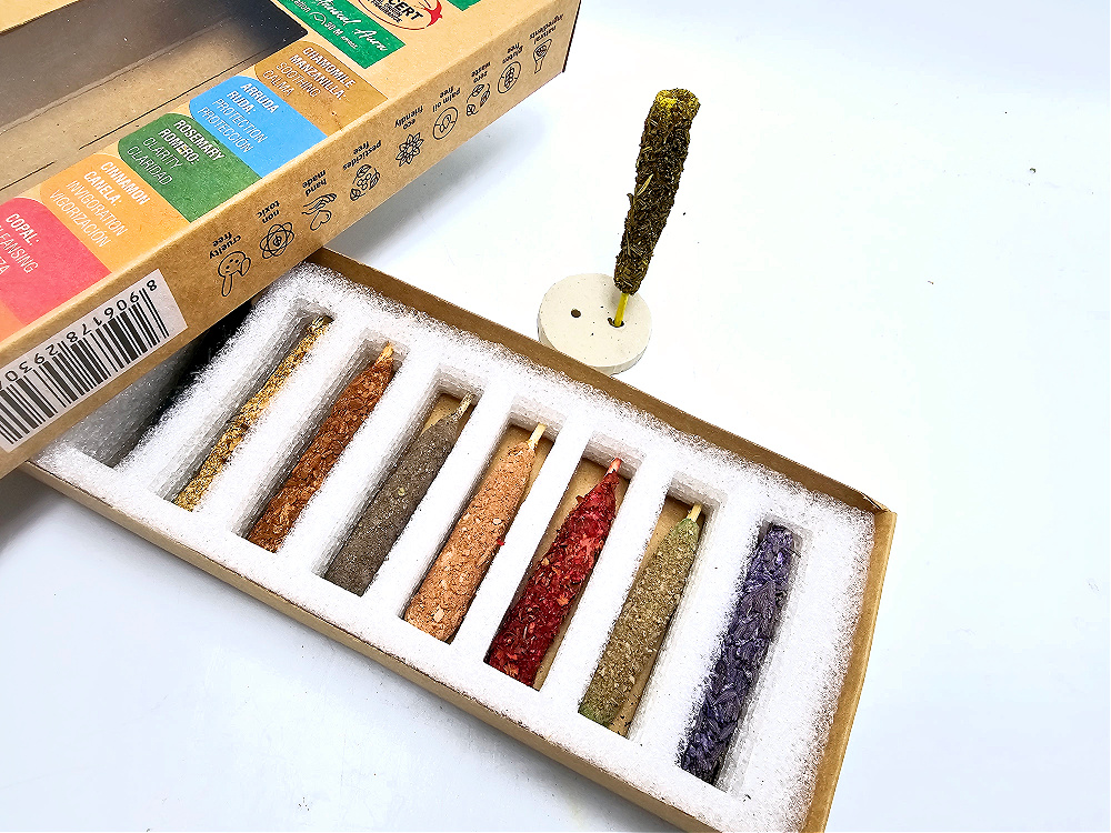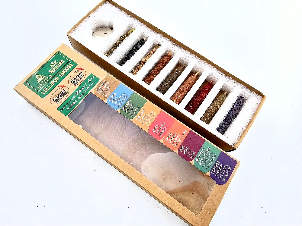 First of its kind Botanical Aura Smudge Sticks. This box has 9 different smudge sticks that burn up to half an hour per stick. Frangrances include, Chamomile for soothing, Ruda for protection, Rosemary for Clarity, Cinnamon for Invigoration, Copal for cleansing, Sandalwood for grounding, Rose for love, White Sage for purificaion and Lavender for relaxation.