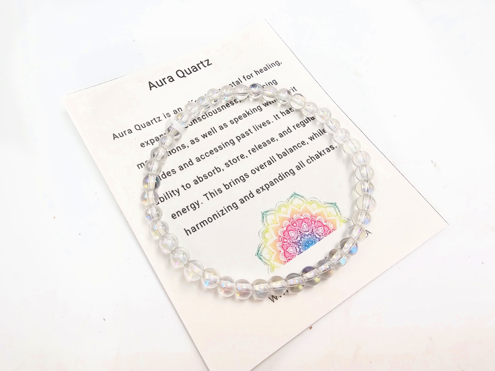 Aura Quartz amplifies and balances our aura in harmony to heal our physical and etheric bodies. It is an effective crystal for healing, expanding consciousness, enhancing meditations, as well as speaking with spirit guides and accessing past lives. It has the ability to absorb, store, release, and regulate energy. It helps to connect the physical dimension to the higher mind unlocking psychic abilities and accessing long lost memories. It blocks off negative frequencies in the air protecting the body from EMF. Aura Quartz has a slight rainbow glow to it in the light.