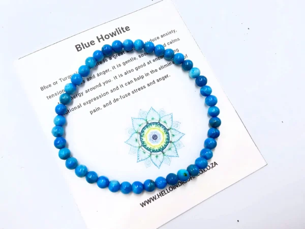 Blue Howlite can assist one with anxiety, tensions, stress and anger. It is gentle, soothing and calms the energy around you. It is also good at encouraging emotions expression and it can help in elimination of pain and de-fuse stress and anger.