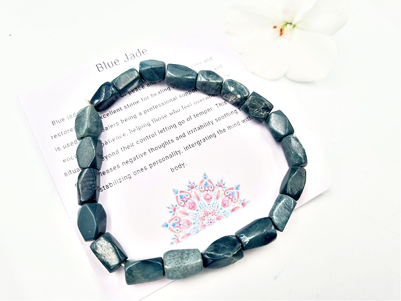 Blue jade is a talisman of peace and serenity, it calms and restores. Its a excellent stone for healing feelings of guilt and is used by all healers being a professional support stone. Jade encourages patience, helping those who feel overwhelmed by situations beyond their control letting go of temper. This dream stone releases negative thoughts and irritability soothing the mind stabilizing ones personality, intergrating the mind with body.