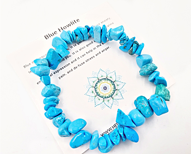 Blue Howlite can assist one with anxiety, tensions, stress and anger. It is gentle, soothing and calms the energy around you. It is also good at encouraging emotions expression and it can help in elimination of pain and de-fuse stress and anger.