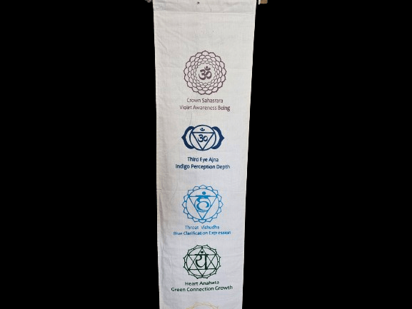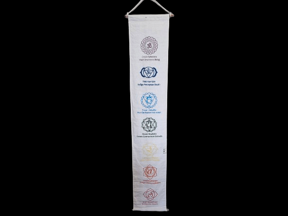 Material Chakra Banner on black backing, ideal for a yoga or meditation room. The Chakras represent 7 personal energy centres that affect our well-being. It is believed that Chakras regulate all functions of our body, mind and spirit. Discover the power of aroma to shift your Chakras and enjoy the beauty of a balanced life.
