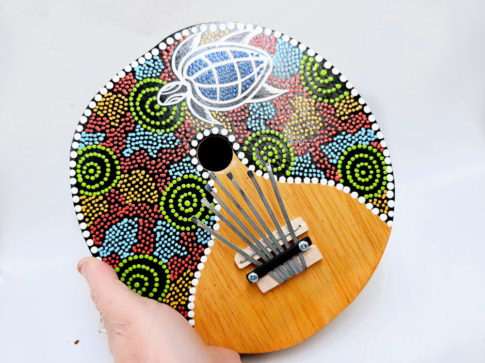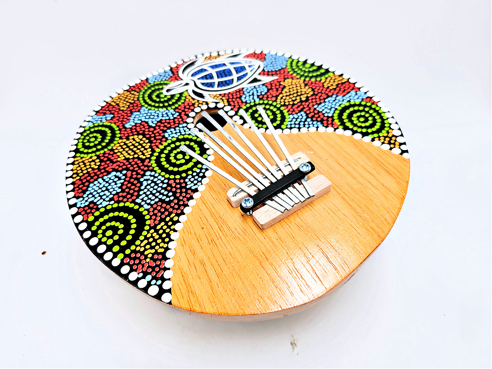 A Coconut Thumb Piano is also known as a Karimbu Karimba Kalimba its a handmade instrument with metal keys that are suspended above the acoustic chamber and when it is plucked with the thumb you can make a beautifully rich note. It can be tuned by adjusting the length of the keys and the tension of the adjustment screws They are a great instrument for children or anybody who wants to join in and play a tune