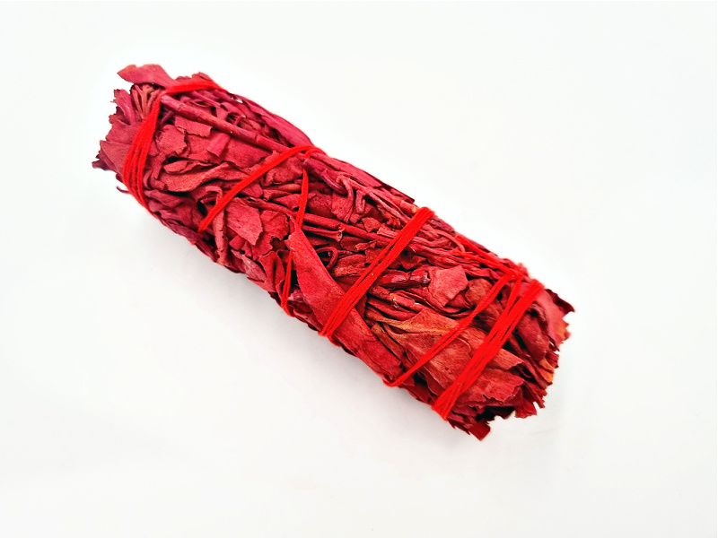 Dragons Blood resin is the hardened red sap of a rare tropical tree with a haunting woody and spicy floral scent. The White Sage is dipped into the resin to add its protective red colouring.