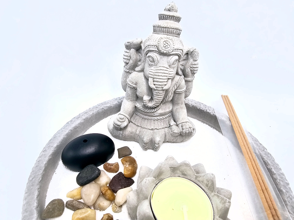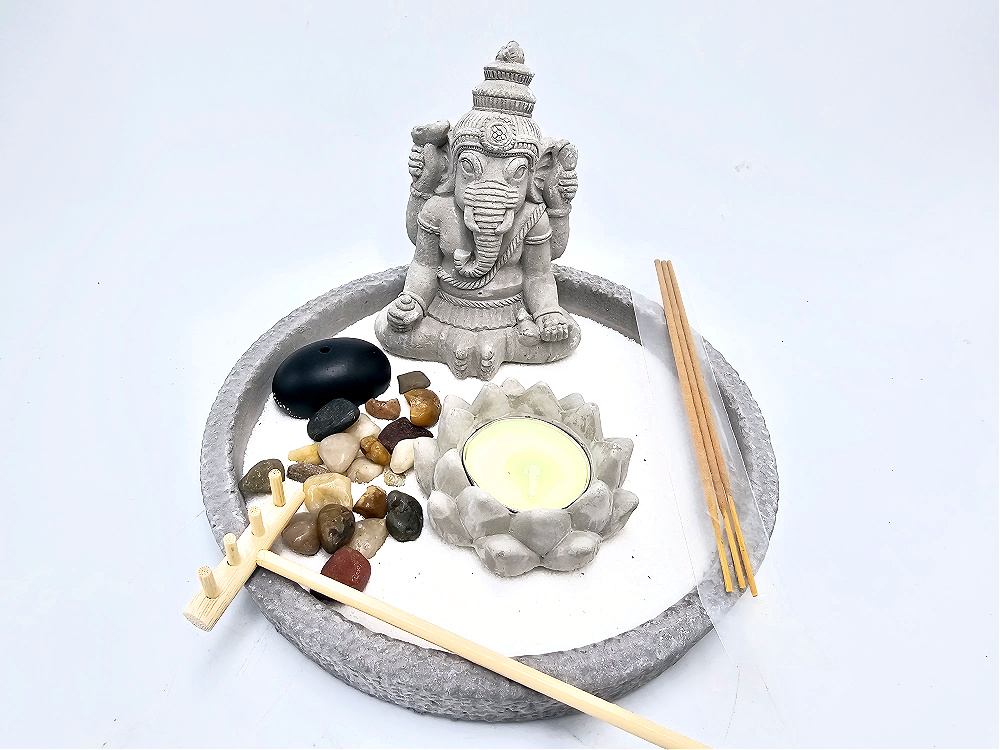 Zen garden consists of: A round stone tray, stone Ganesha, rake, incense hodler, incense, stones, sand, rake, candle