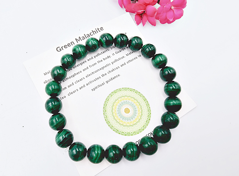 Malachite is an important protection stone. It absorbs negative energies and pollutants, picking them up from the atmosphere and from the body. It guards against radiation and clears electromagnetic pollution. Malachite also clears and activates the chakras and attunes to spiritual guidance.