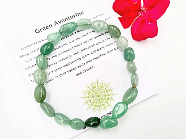 Green Aventurine is one of the luckiest stones. It is also useful to release old patterns, habits and disappointments so new growth can take place. It enhances creativity and motivation giving you a zest for life. It is a great manifesting stone and many users hold a piece firmly in their hands while they manifest their dreams and desires.