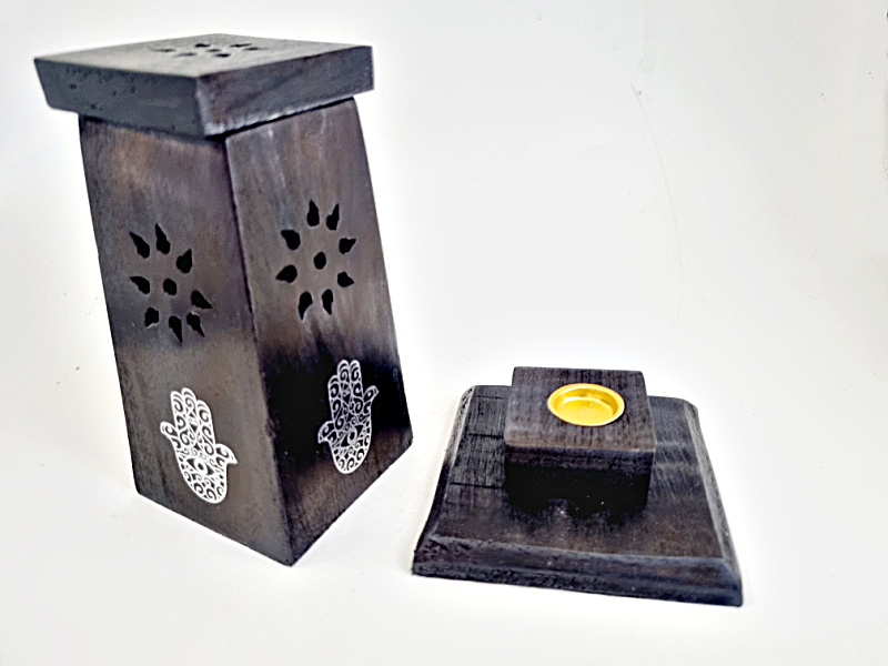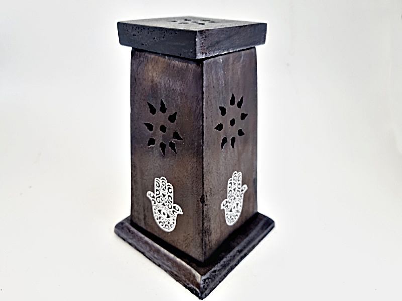 Hamsa Hand Cone Box Tower carved from wood and painted black & silver.
