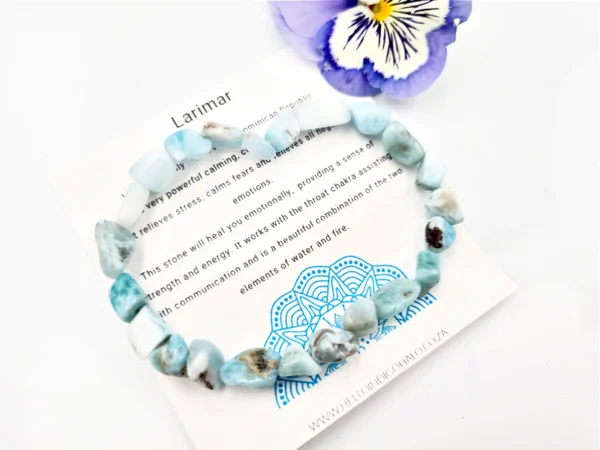Larimar is only found in the Dominican Republic. It has a very powerful calming, cooling and serene energy. It relieves stress, calms fears and assists with all negative emotions. This stone will heal you emotionally, providing a sense of strength and energy. It works with the throat chakra assisting with communication and is a beautiful combination of the two elements of water and fire.Â