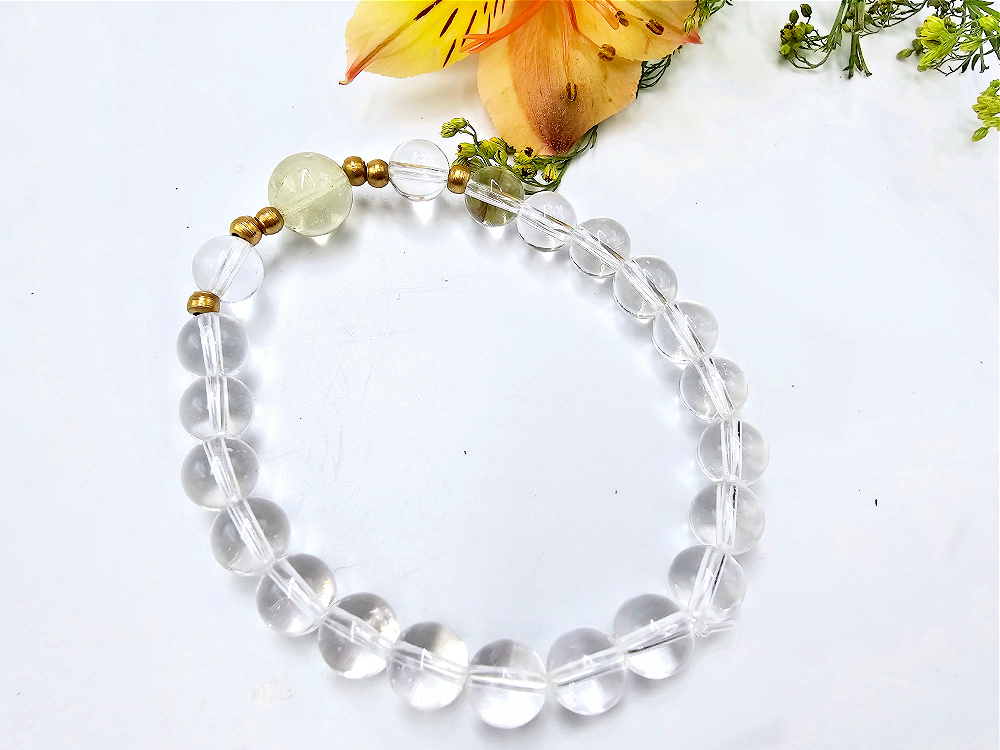 Size: 10mm Libyan Desert Glass Bead & 8mm Clear Quartz beads, Brass beads inbetween.