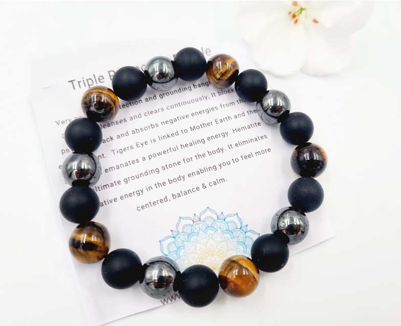 Very powerful protection and grounding bangle. Black Obsidian cleanses and clears continuously, It blocks psychic attack and absorbs negative energies from the environment. This is a very powerful cleanser and psychic protection stone. Tigers Eye is linked to Mother Earth and the sun which emanates a powerful healing energy. When you connect to this energizing stone fully you will have the inner power to. push through any obstacle that appears in your way. Hematite is the ultimate grounding stone for the body. It eliminates all negative energy in the body enabling you to feel more centered, balance & calm. These stones have a protective energy and assists in stimulating the mind, heightening self-confidence, self-esteem, and willpower.
