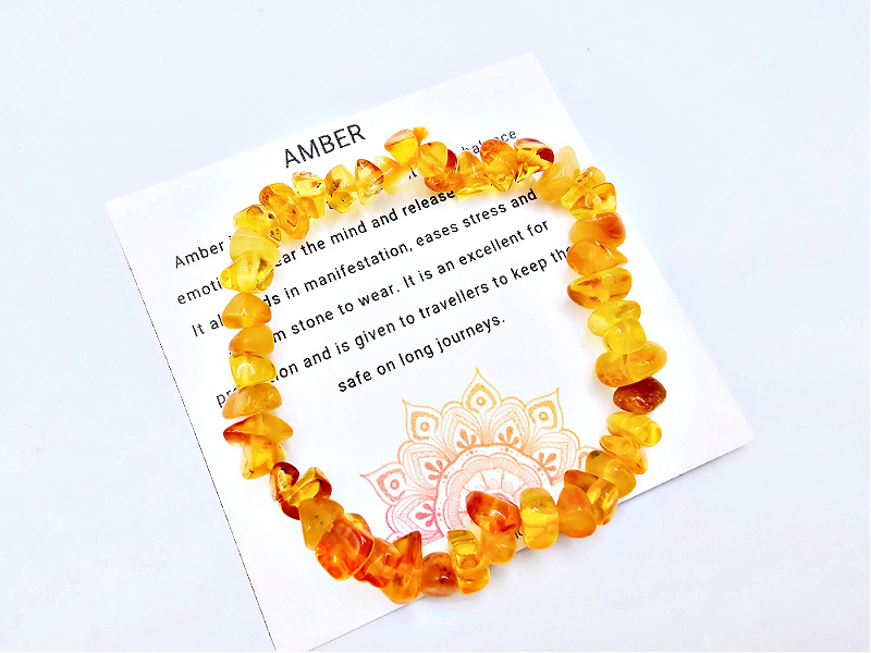 Amber is fossilized tree resin. It helps balance emotions, clear the mind and release negativity. It also aids in manifestation and is given to travelers to keep them safe on long journeys.