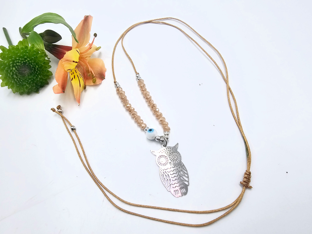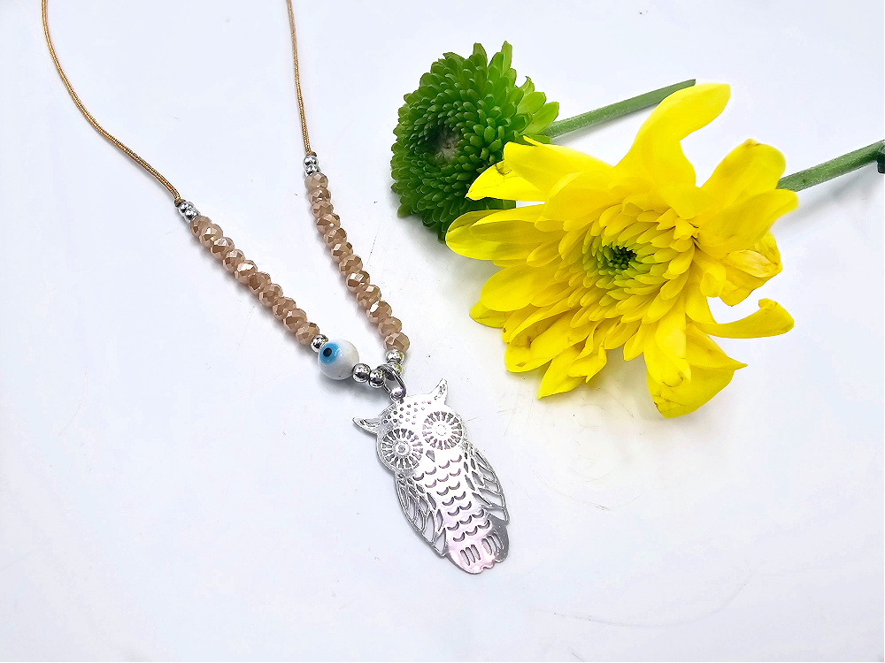 A stunning necklace with a silver owl charm and an evil eye bead.