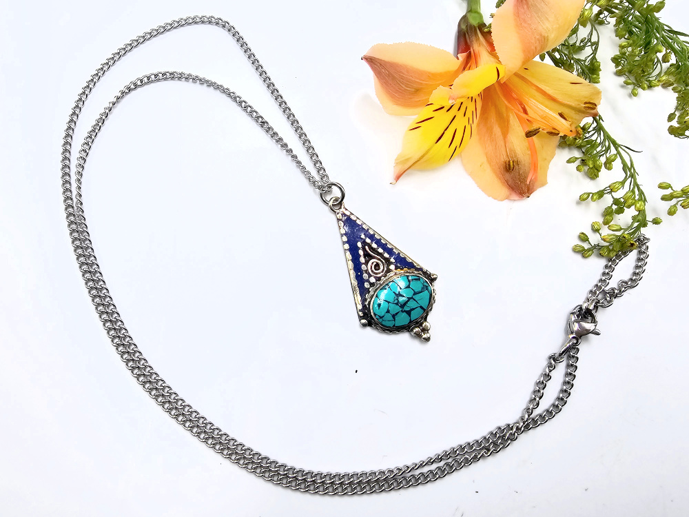 Handcrafted in the heart of Nepal, this striking Tibetan necklace blends traditional design with deep spiritual symbolism.