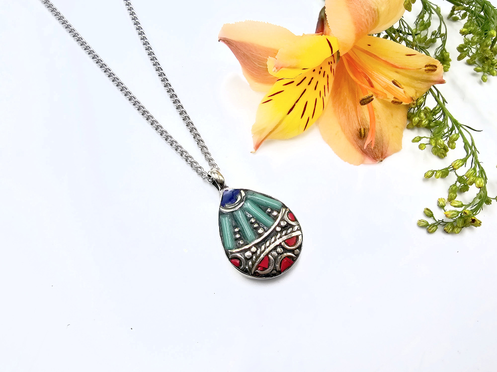 Handcrafted in the heart of Nepal, this striking Tibetan necklace blends traditional design with deep spiritual symbolism.Â